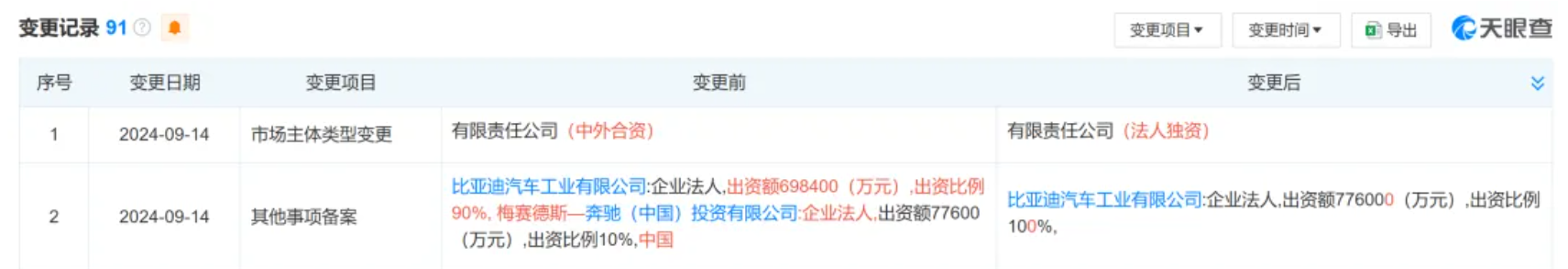 天眼查显示,2024年9月14日,腾势汽车发生股权变更,比亚迪汽车的持股比例由90%上升至100%,出资金额从69.84亿元上升到77.6亿元。